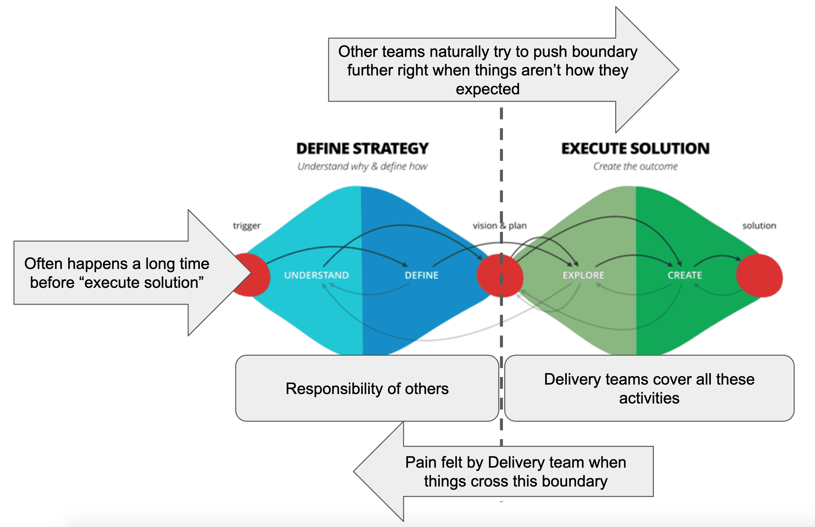 If a team stays in this phase or this is considered the “end” of the transformation things can get very difficult. The Delivery team don’t really understand why they are building what they are building, even if they become very good at building it. Pressure to blur the boundary back towards the right increases so that teams don’t ‘build the wrong thing’ again so processes are setup and theatre between these two sides increases. The “define strategy” phase can happen months if not years before the “execute solution” phase. This leads to more chance that the strategy that was defined, is incorrect. When the deliver team come to execute the solution they will suffer more blocked stories, more dependencies on other teams and more stories that are perhaps just plain irrelevant any more. This involves crossing the boundary to get answers to their questions, and the more times they have to do this the more pain they feel during development.